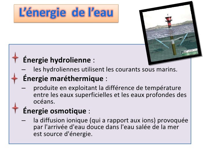 Les L énergie maréthermique (ou énergie thermique des mers - ETM) est produite en exploitant la différence de température entre les eaux superficielles et les eaux profondes des océans. Les ressources énergétiques de l hydrosphre - Hydrosphre L énergie maréthermique est produite en exploitant la différence de température entre les eaux superficielles qui sont chauffées par le soleil et les eaux profondes des océans qui ont approximativement une température de degrés Celsius.