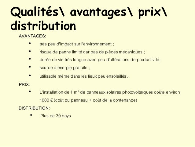 Cette manifestation est organisée par Enerplan, lassociation des professionnels de lEnergie solaire et se résume en grande partie à des journées portes ouvertes chez des acteurs de la filire solaire. AVANTAGES ET INCONVENIENTS DES PANNEAUX SOLAIRES - TPE Un panneau solaire a une durée de vie de ans environ, au-delà, les rendements diminuent rapidement. Les panneaux produisent beaucoup l été mais les besoins sont faibles.